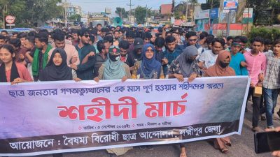 লক্ষ্মীপুর প্রতিনিধি : ছাত্র-জনতার গণঅভ্যুত্থানের মাস পূর্ণ হওয়াতে শহীদদের স্মরণে লক্ষ্মীপুরে শহীদি মার্চ কর্মসূচি পালন করেছে বৈষম্যবিরোধী ছাত্র আন্দোলনের শিক্ষার্থীরা। বৃহস্পতিবার (৫ সেপ্টেম্বর) বিকেল ৩টার দিকে শহরের বিজয় চত্বর (ঝুমুর) বিস্তারিত...