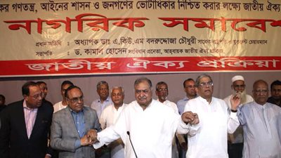 আকাশবার্তা ডেস্ক : শনিবার (২২ সেপ্টেম্বর) বিকেলে রাজধানীর মহানগর নাট্যমঞ্চে হাতে হাত রেখে ঐক্যের ঘোষণা দিয়েছেন জাতীয় ঐক্য প্রক্রিয়ার সমাবেশে অংশ নেওয়া রাজনৈতিক দলের নেতাকর্মীরা। এর মাধ্যমে ঐক্যবদ্ধভাবে রাজননৈতিক অঙ্গনে বিস্তারিত...