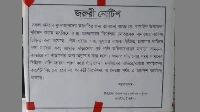 আকাশবার্তা ডেস্ক : টাঙ্গাইলের বাসাইল উপজেলা পরিষদ জামে মসজিদের প্রথম কাতারে বসবেন অফিসাররা, অন্য কেউ বসতে পারবেন না। এ সংক্রান্ত একটি জরুরি নোটিশ স্বাস্থ্য মন্ত্রণালয়ের বরাত দিয়ে মসজিদে প্রবেশের দরজাসহ বিস্তারিত...