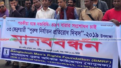 আকাশবার্তা ডেস্ক : পরকীয়া বন্ধে দণ্ডবিধি ৪৯৭ ধারার সংশোধন দাবি করেছেন ‘বাংলাদেশ পুরুষ অধিকার ফাউন্ডেশন’র (বাপুঅফা) নেতারা। আজ পুরুষ নির্যাতন প্রতিরোধ দিবস উপলক্ষে এক মানববন্ধনে তারা এ দাবি তোলেন। সকাল বিস্তারিত...