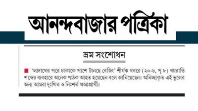 আকাশবার্তা ডেস্ক : কলকাতার প্রথম সারির দৈনিক আনন্দবাজার পত্রিকা সম্প্রতি বাংলাদেশ সম্পর্কে এক প্রতিবেদনে ‘খয়রাতি’ শব্দ ব্যবহার করার জন্য নিঃশর্ত ক্ষমা ও দুঃখ প্রকাশ করেছে। আজ মঙ্গলবার (২৩ জুন) পত্রিকায় বিস্তারিত...