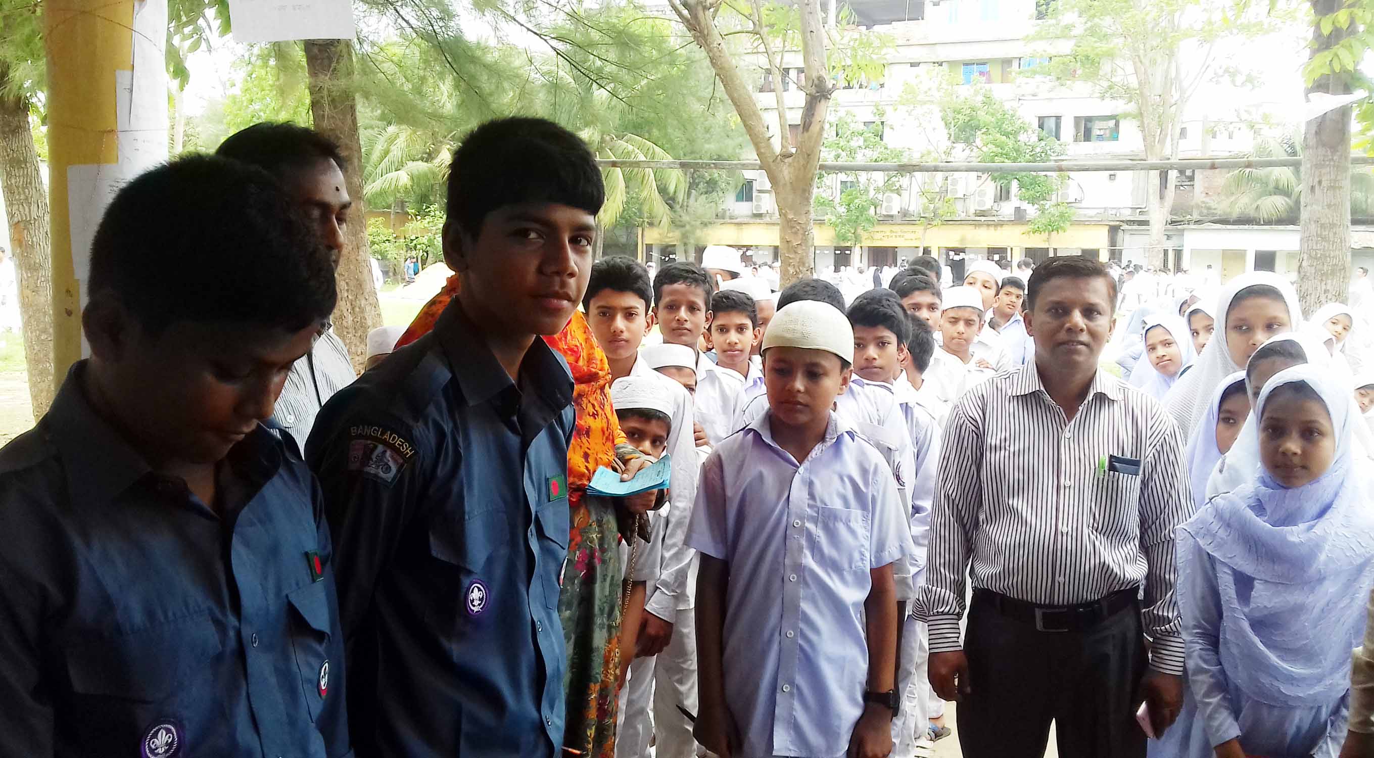 প্রতাপগঞ্জ উচ্চ বিদ্যালয়ে লাইনে দাঁড়িয়ে ভোট প্রয়োগ করছে শিক্ষার্থীরা।