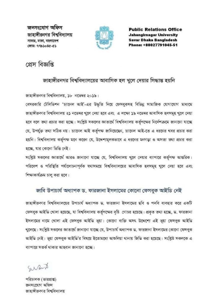 জাহাঙ্গীরনগর বিশ্ববিদ্যালয়ের (জাবি) হল খোলার সিদ্ধান্ত নেয়নি প্রশাসন, এই মর্মে ১৮ নভেম্বর (সোমবার) এক প্রেস বিজ্ঞপ্তি প্রকাশ করেছে বিশ্ববিদ্যালয়ের জনসংযোগ অফিস।