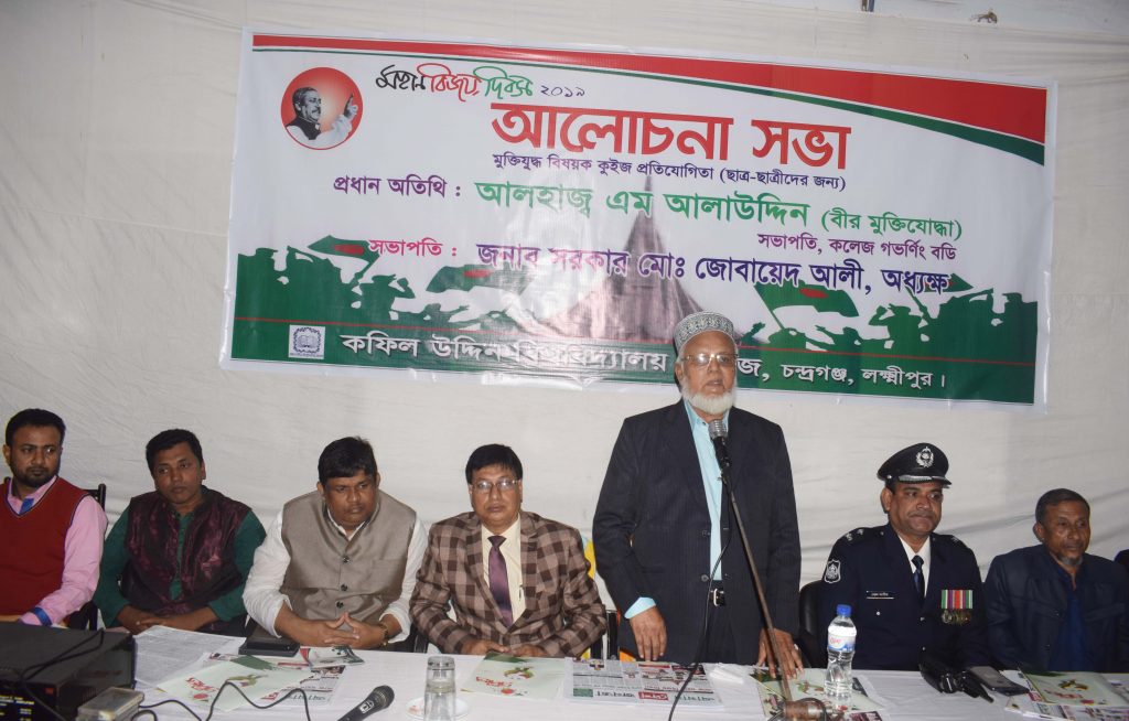 কলেজের অধ্যক্ষ সরকার মো. জোবায়েদ আলীর সভাপতিত্বে আলোচনা সভায় প্রধান অতিথির বক্তব্য রাখেন, কলেজ গভর্ণিং বডির সভাপতি জেলা আওয়ামীলীগের সাবেক সভাপতি আলহাজ এম আলাউদ্দিন। বিশেষ অতিথির বক্তব্য রাখেন- চন্দ্রগঞ্জ হাইওয়ে থানার অফিসার ইনচার্জ (ওসি) মো. রুহুল আমিন ও জেলা জাতীয় পার্টির সহ-সভাপতি সামছুদ্দিন পাটোয়ারী। এছাড়াও বক্তব্য রাখেন- চন্দ্রগঞ্জ প্রেসক্লাবের সভাপতি ও সুশাসনের জন্য নাগরিক চন্দ্রগঞ্জ থানা কমিটির সভাপতি মো. আলী হোসেন, গভর্ণিং বডির সদস্য কামরুজ্জামান নিজাম, কামাল হোসেন ও শিক্ষক আসিফুর রহমান প্রমুখ।