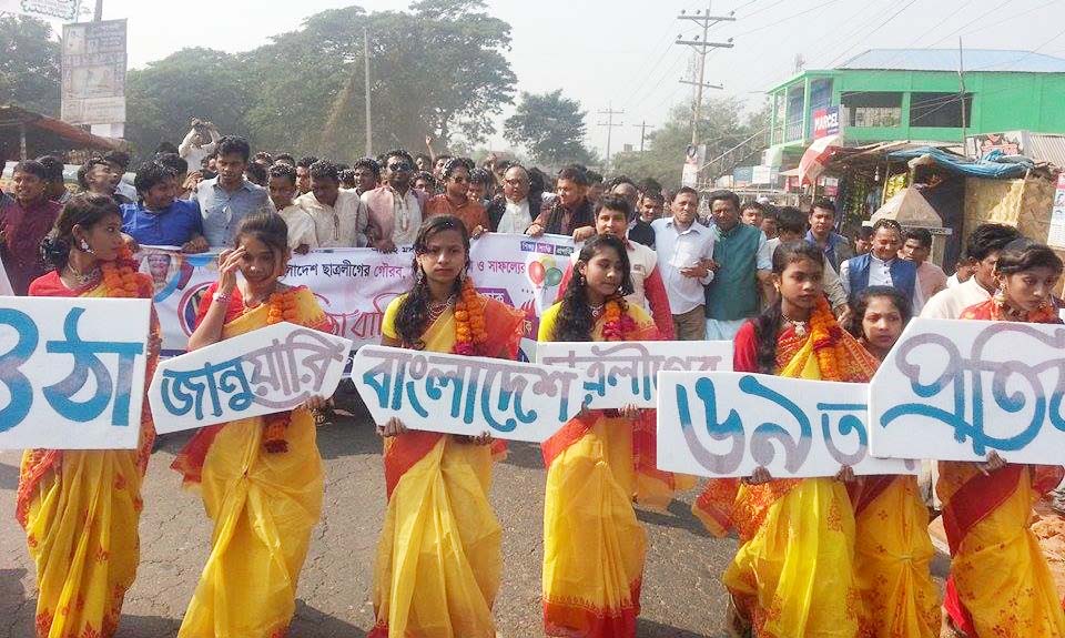 সকালে জেলা ছাত্রলীগের উদ্যোগে শহরের উত্তর তেমুহনী থেকে বর্ণাঢ্য র্যালি বের করা হয়। উৎসব মুখর পরিবেশে ব্যান্ডের তালে তালে কয়েক হাজার নেতা-কর্মী র্যালিতে অংশ নেয়। এ সময় সাবেক ছাত্রনেতা ও জেলা আ.লীগের বিজ্ঞান ও প্রযুক্তি বিষয়ক সম্পাদক এ্যাড. রাসেল মাহমুদ মান্না, সাবেক ছাত্রনেতা নজরুল ইসলাম ভুলুসহ জেলা ও পৌর ছাত্রলীগের নেতৃবৃন্দ উপস্থিত ছিলেন।