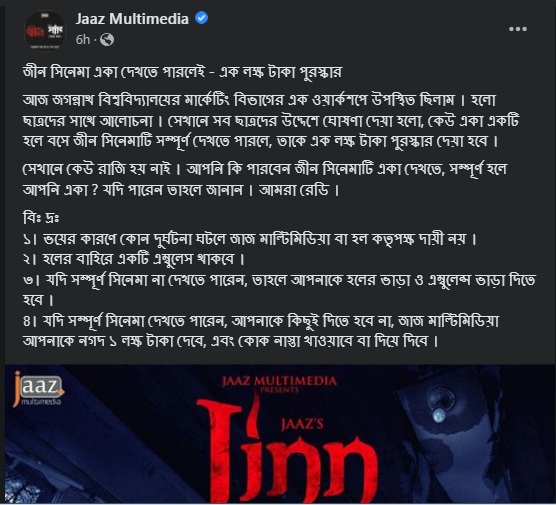 শনিবার (৪ এপ্রিল) বিকেলে ঘোষণাটি জাজ মাল্টিমিডিয়ার ফেসবুক পেজ থেকে দেওয়া হয়েছে। সেখানে এ প্রসঙ্গে লেখা হয়েছে, ‘জ্বীন সিনেমা একা দেখতে পারলেই – এক লক্ষ টাকা পুরস্কার। আজ শনিবার জগন্নাথ বিশ্ববিদ্যালয়ের মার্কেটিং বিভাগের এক ওয়ার্কশপে উপস্থিত ছিলাম। ছাত্রদের সাথে আলোচনা হলো। সেখানে সব ছাত্রদের উদ্দেশে ঘোষণা দেয়া হলো, কেউ একা একটি হলে বসে জীন সিনেমাটি সম্পূর্ণ দেখতে পারলে, তাকে এক লক্ষ টাকা পুরস্কার দেয়া হবে।’