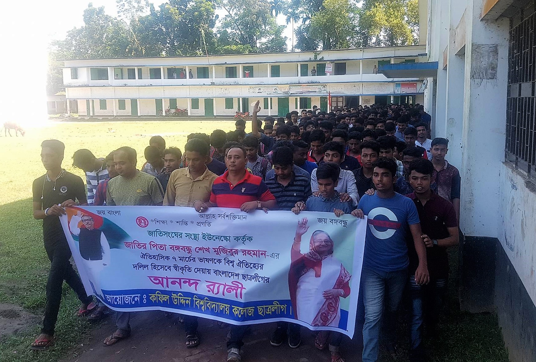 বঙ্গবন্ধুর ঐতিহাসিক ৭ই মার্চের ভাষণকে ‘ইউনেস্কো’ কর্তৃক মেমোরী অব দ্যা ওয়ার্ল্ড বুকে স্বীকৃতি দেওয়া লক্ষ্মীপুরে অভিনন্দন র‌্যালি করেছে ছাত্রলীগ। রোববার বেলা ১১টায় জেলার কফিল উদ্দিন বিশ্ববিদ্যালয় কলেজ ক্যাম্পাসে এ অভিনন্দন র‌্যালি অনুষ্ঠিত হয়। র‌্যালিটি কলেজের শহীদ মিনার প্রাঙ্গণ থেকে শুরু হয়ে কলেজ ক্যাম্পাস পদক্ষিণ করে ছাত্র সংসদের সামনে গিয়ে সমাবেশ করে।