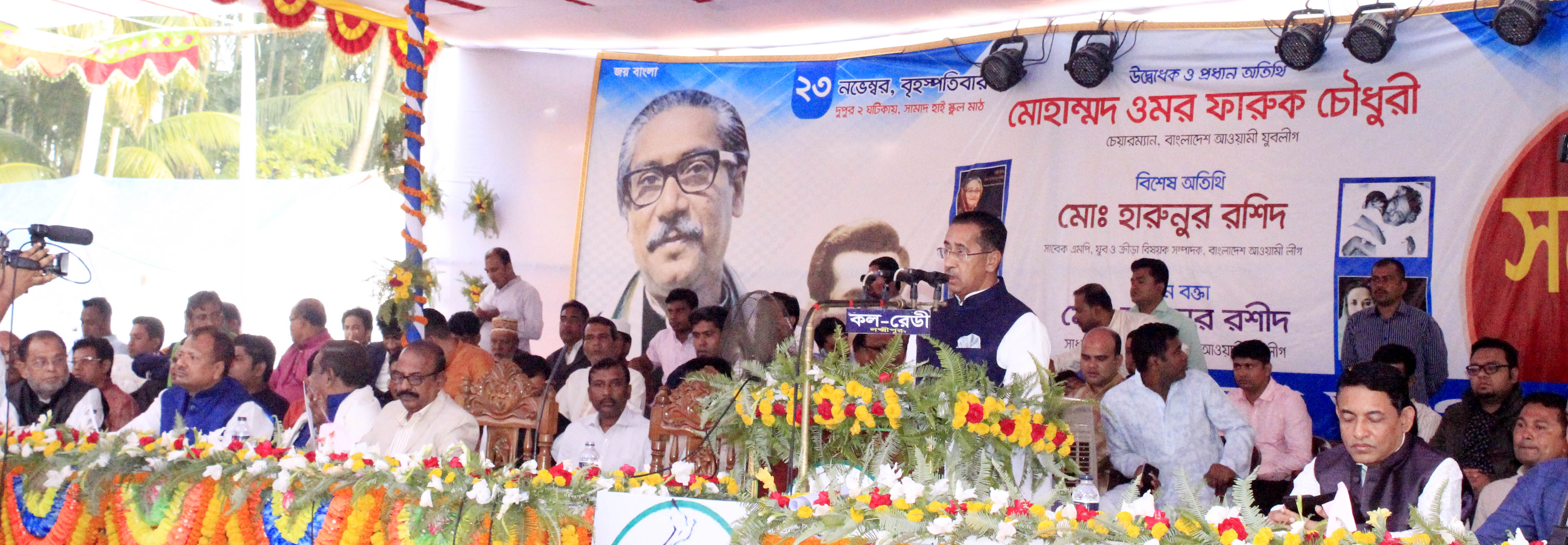 বৃহস্পতিবার বিকেলে লক্ষ্মীপুর আদর্শ সামাদ সরকারি উচ্চ বিদ্যালয় মাঠে জেলা যুবলীগের ত্রি-বার্ষিক সম্মেলনে প্রধান অতিথির বক্তৃতা করছেন যুবলীগ চেয়ারম্যান ওমর ফারুক চৌধুরী এবং মঞ্চে উপস্থিত অন্যান্য নেতৃবৃন্দ।