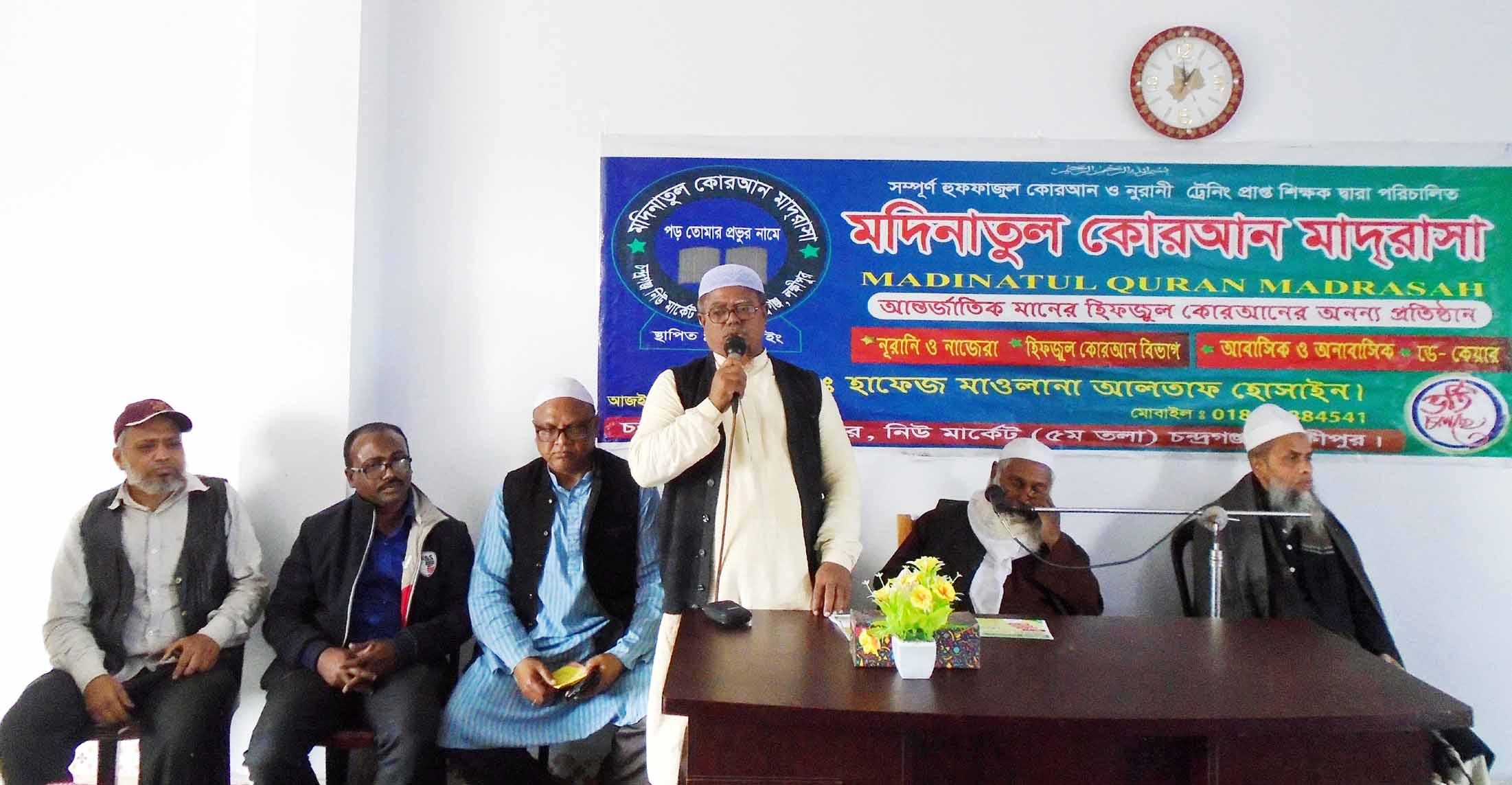 কোরআন শিক্ষাসহ দ্বীনি শিক্ষাপ্রতিষ্ঠান মদিনাতুল কোরআন মাদ্রাসার উদ্বোধন (ছবক প্রদান) করা হয়েছে। লক্ষ্মীপুরের চন্দ্রগঞ্জ নিউ মার্কেটের ৫মতলায় প্রতিষ্ঠিত হয় এই মাদ্রাসা। সোমবার দুপুরে মাদ্রাসা মিলনায়তনে অনুষ্ঠিত উদ্বোধনী অনুষ্ঠানে প্রধান মেহমান ছিলেন, কওমী মাদ্রাসা বোর্ডের শিক্ষা সচিব আল্লামা শিব্বির আহম্মদ সাহেব (দাঃ বাঃ)।