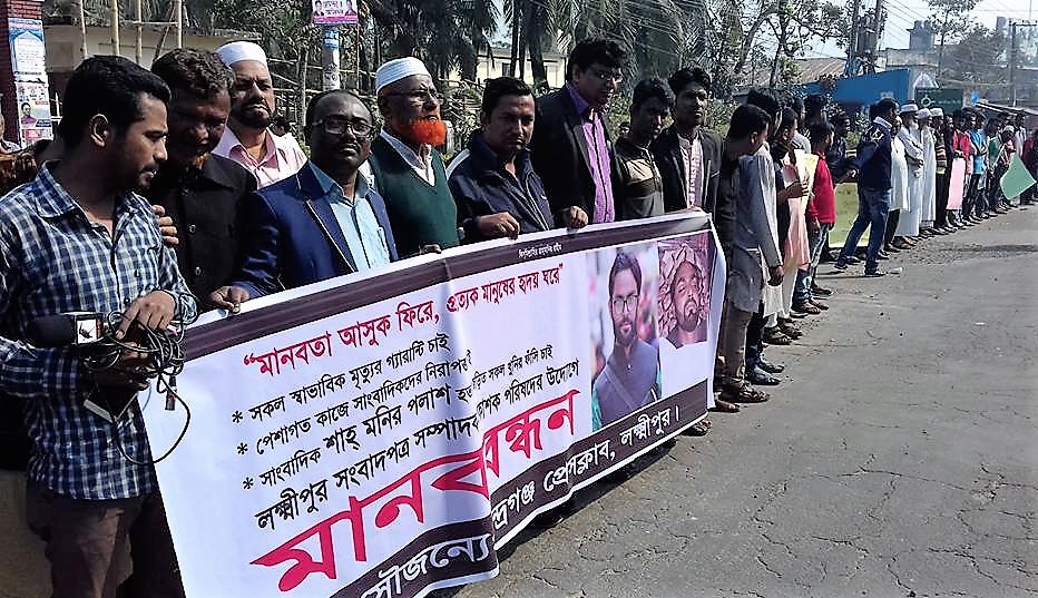মানববন্ধনের বক্তব্য রাখেন, লক্ষ্মীপুর সম্পাদক-প্রকাশক পরিষদের সভাপতি মোঃ কামাল উদ্দিন হাওলাদার, চন্দ্রগঞ্জ প্রেসক্লাবের সভাপতি আলী হোসেন, সম্পাদক-প্রকাশক পরিষদের সাধারণ সম্পাদক মোঃ সহিদুল ইসলাম সহিদ, দপ্তর ও প্রচার সম্পাদক আফজাল হোসেন সবুজ, দৈনিক আলোকিত লক্ষ্মীপুরের সম্পাদক অ্যাডভোকেট হাফিজ উল্যাহ, সাংবাদিক জাহাঙ্গীর আলম, একিউএম সাহাবুদ্দিন, সাংবাদিক অধ্যক্ষ আবদুন নূর, জহিরুল ইসলাম শিবলু, তোফায়েল আহম্মেদ, একেএম মিজানুর রহমান, প্রভাষক মানছুর রহমান, রজিব-উজ-জামান, যুবলীগ নেতা সাইফুল ইসলাম মিঠু, আবদুল ওয়াহাব ভূঁইয়া প্রমুখ।