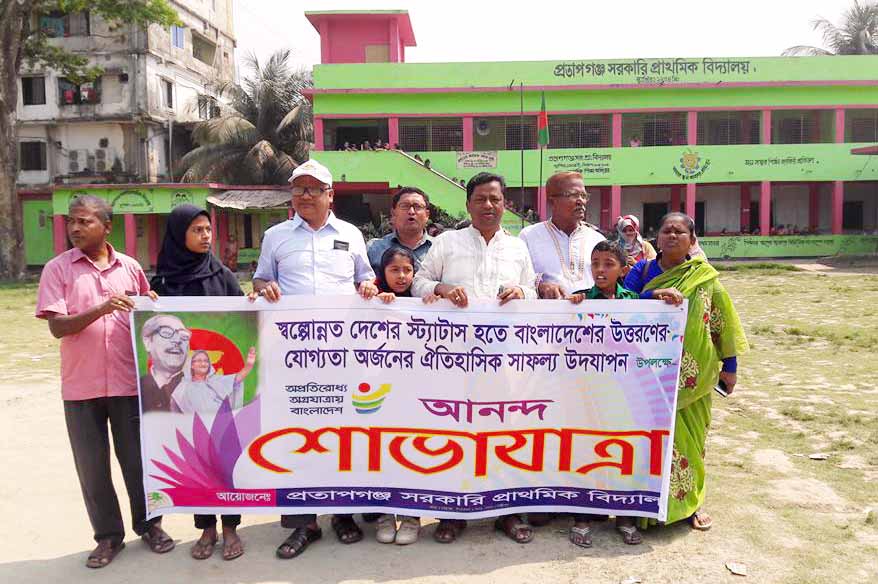 বাংলাদেশ স্বল্পোন্নত দেশের স্ট্যাটাস হতে ‘উন্নয়নশীল’ দেশে উত্তরণের যোগ্যতা অর্জন করায় লক্ষ্মীপুরের চন্দ্রগঞ্জে আনন্দ শোভাযাত্রার আয়োজন করেছে প্রতাপগঞ্জ উচ্চ বিদ্যালয় ও প্রতাপগঞ্জ সরকারি প্রাথমিক বিদ্যালয়।