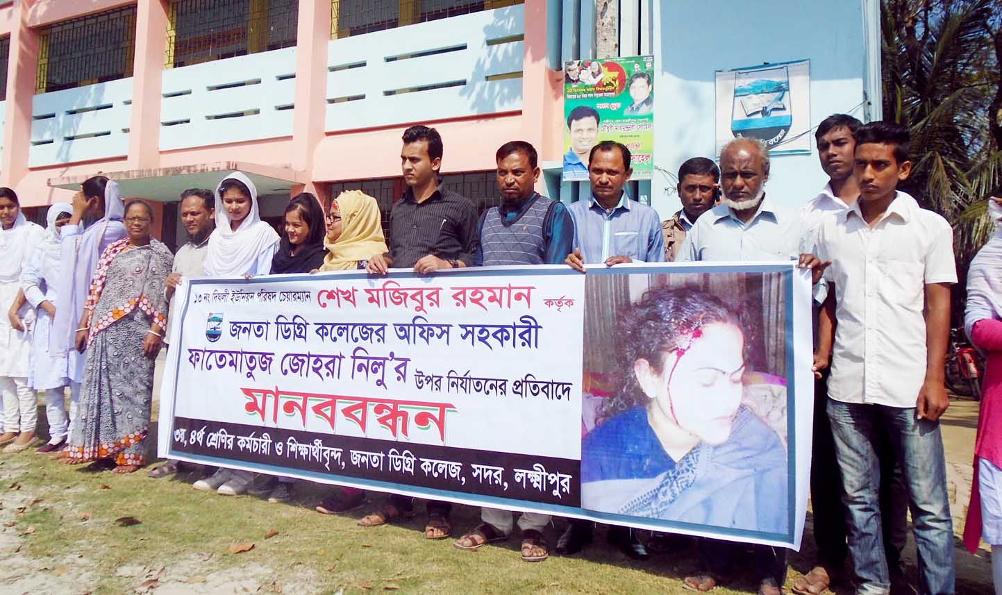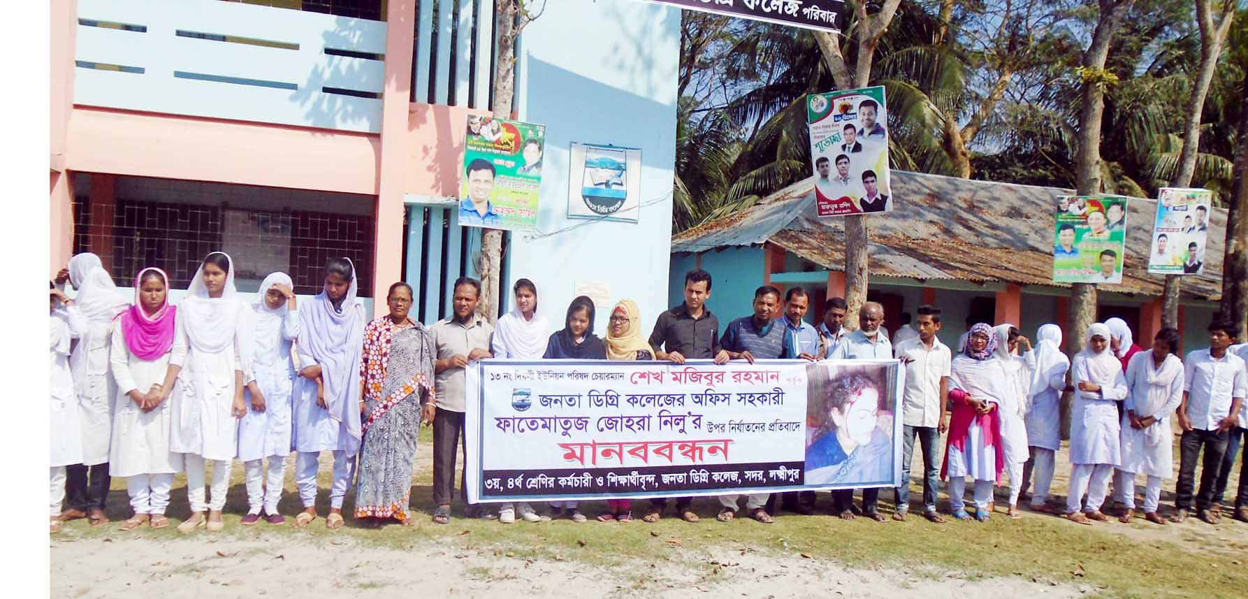 লক্ষ্মীপুর সদর উপজেলার দিঘলী ইউনিয়নে প্রেমিকা ফাতেমাতুজ জোহরা নিলুকে মারধর ও শারীরিক নির্যাতনের প্রতিবাদে জনতা ডিগ্রী কলেজের ৩য় ও ৪র্থ শ্রেণির কর্মচারী এবং শিক্ষার্থীরা মানববন্ধন পালন করছেন।