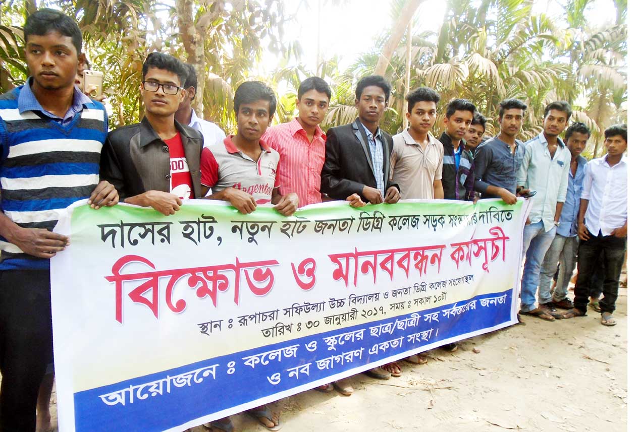 লক্ষ্মীপুরে সদর উপজেলা দাসেরহাট, নতুনহাট ও জনতা কলেজ সংলগ্ন প্রায় ১২ কিলোমিটার খাদাখন্দে ভরা সড়কের সংস্কারের দাবিতে বিক্ষোভ মিছিল ও মানববন্ধন করেছে শিক্ষার্থীরা। সোমবার সকালে স্থানীয় স্বেচ্ছাসেবী সংগঠন নবজাগরণ একতা সংস্থার উদ্যোগে স্থানীয় জনতা কলেজ ও রূপাচরা সফিউল্যা উচ্চ বিদ্যালয়ের কয়েক হাজার শিক্ষার্থী ঘন্টাব্যাপী এ মানববন্ধন কর্মসূচি পালন করেন। এ সময় বক্তব্য রাখেন, সংগঠনের সভাপতি আলমগীর হোসেন শাওন, সাধারণ সম্পাদক মোরশেদুল ইসলামসহ স্থানীয় গণ্যমাণ্য ব্যক্তিবর্গ।